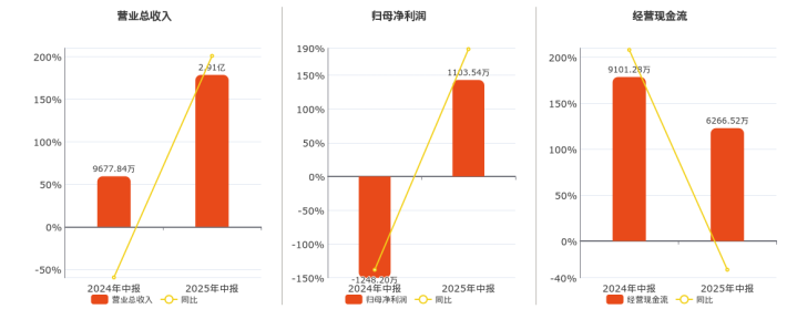 公司营业总收入为2.91亿元,较去年同报告期营业总收入增加1.94亿元,同比较去年同期上涨200.78%。归母净利润为1103.54万元,较去年同报告期归母净利润增加2351.74万元。经营活动现金净流入为6266.52万元。